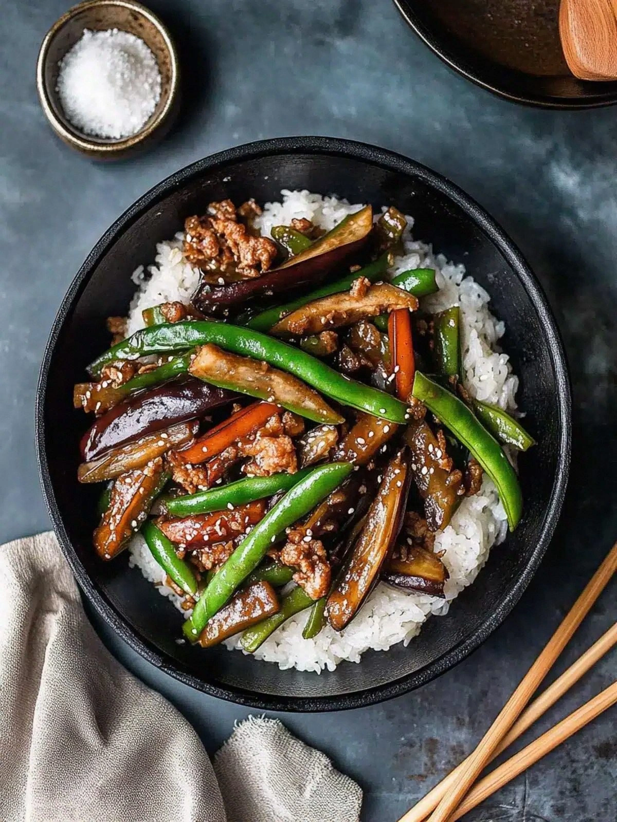 Picture this: the aroma of fresh ginger and garlic sizzling in hot oil, the faint crackle of a wok at high heat, and the moment the eggplants begin to caramelize, their skins blistering into a caramelized, almost charred sheen. The sound of the green beans popping as they hit the pan, the subtle pop of the chili pepper releasing its heat, and the final splash of soy sauce that gives the dish that glossy finish. The texture is a contrast of tender, melt‑in‑your‑mouth eggplant against the bright, slightly crunchy beans. The taste is a harmonious blend of sweet, savory, and a hint of heat that lingers on the tongue, leaving you craving a second bite.